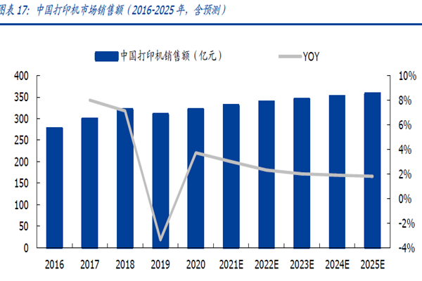 据赛迪顾问数据统计,2020年全球打印机市场销售额达到了421.2亿美元,其出货量为8768.7万台。预计到2025年全球打印机市场销售额约达411.2亿美元,相对应打印机出货量约达8279.3万台,CAGR约为-0.49%。