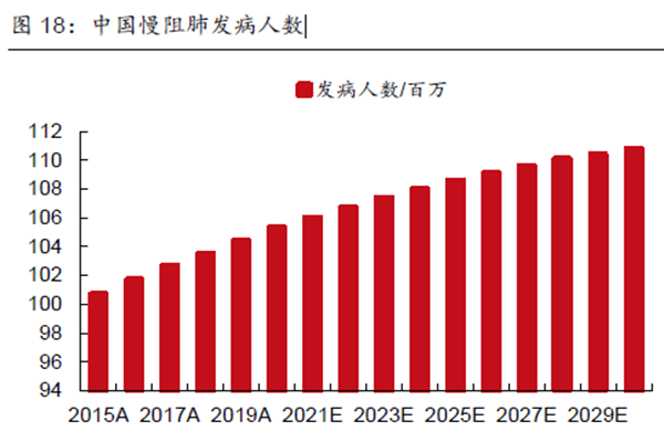 此外,中国慢阻肺总患病人数约1亿人。其中年龄越大,患病几率越。据数据统计,60岁以上的人群患病率高达27%。由此可见,未来将持续上升。