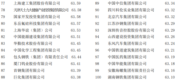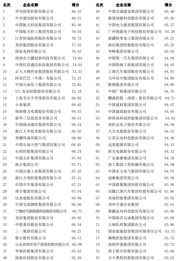 2022中国大企业创新100强发布,据名单显示,100强中排名前十的企业为华为投资控股有限公司、中兴通讯股份有限公司、中国航天科技集团有限公司、中国航天科工集团有限公司、江苏恒瑞医药股份有限公司、美的集团股份有限公司、国家电网有限公司、深圳市大疆创新科技有限公司、中国信息通信科技集团有限公司、正大天晴药业集团股份有限公司,得分分别为96.55、84.51、83.06、79.04、78.72、77.02、76.63、74.84、74.03、73.33。