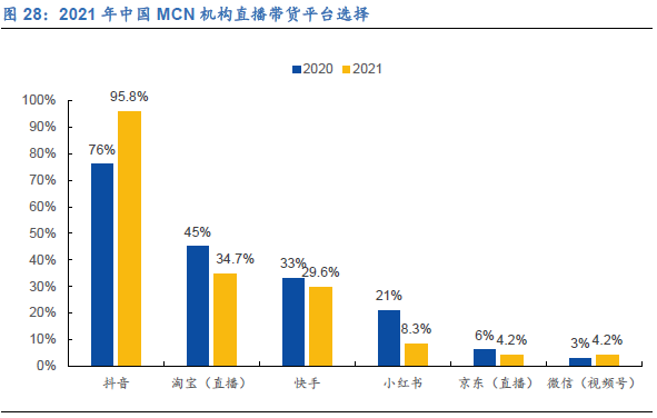 机构选择以抖音、淘宝直播、快手为直播带货平台的占比分别为95.8%/34.7%/29.6%。其中抖音占比较上年提升 19.8pct,是对 MCN